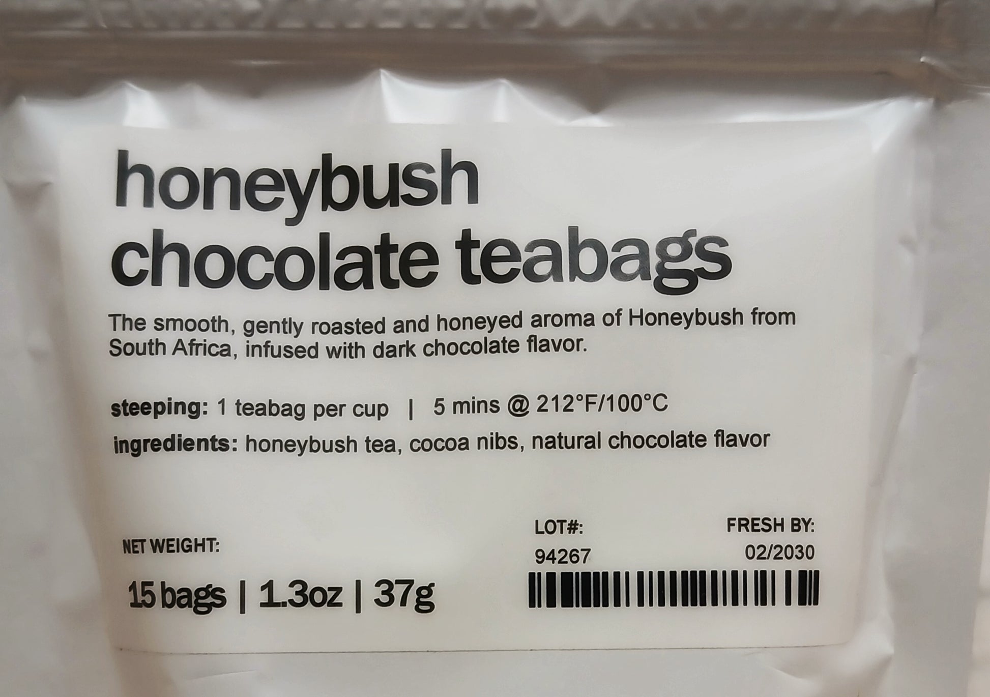- Ingredients: Honeybush tea, cocoa nibs, natural chocolate flavor