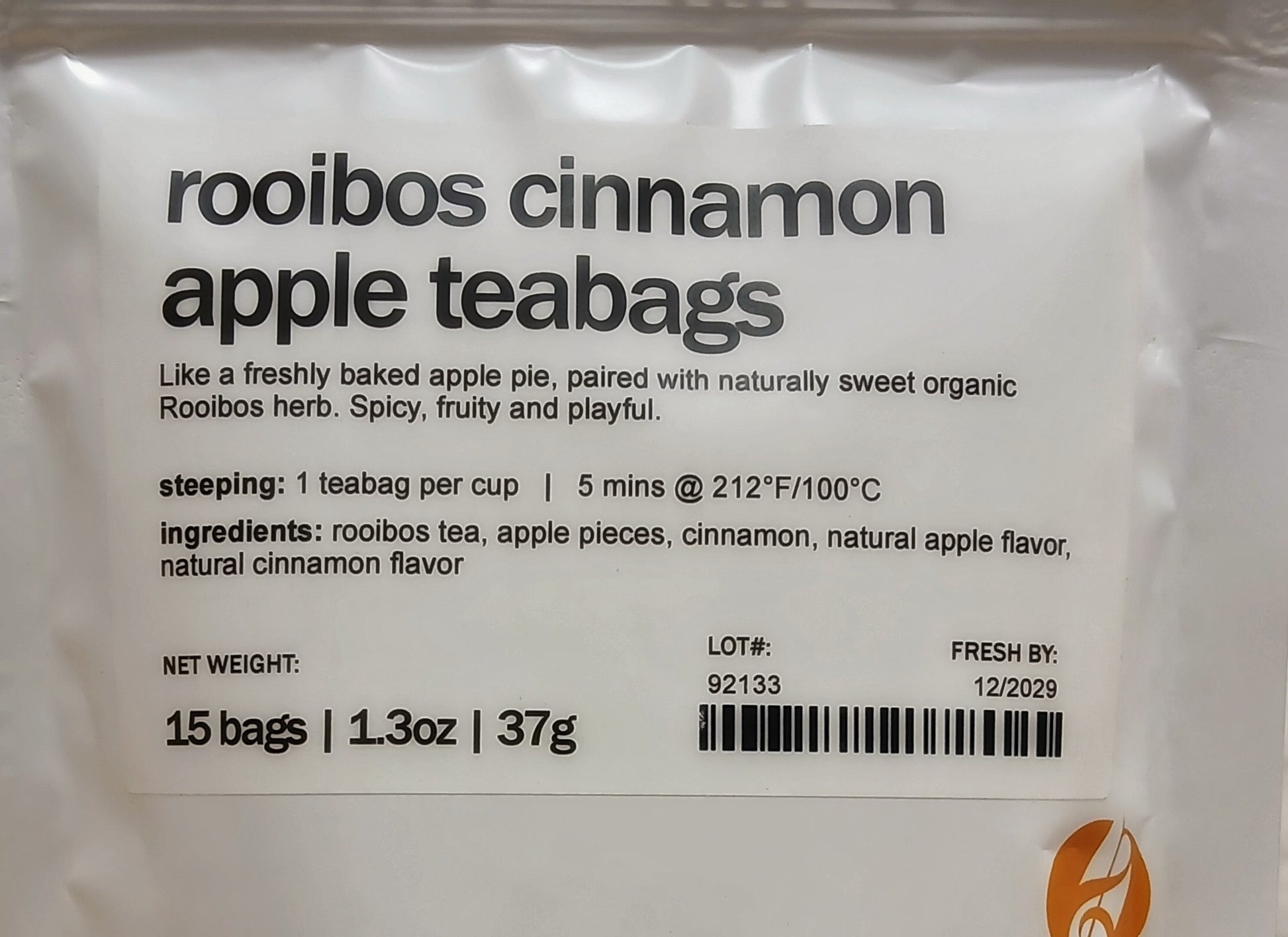 - Ingredients: Rooibos tea, apple pieces, cinnamon, natural apple flavor, natural cinnamon flavor